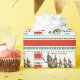 Funny elves family of five, on a very festive green and red holiday pattern as background. Customise Merry Christmas typography and personalise with family name and year.