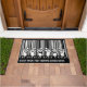 A black doormat with a barcode design featuring cartoon feet with different expressions. The barcode is labelled Scan Your Feet Before Enter Door.