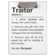 A humourous definition of "Traitor" is presented as a dictionary entry with a sarcastic tone, suggesting the term refers to a valued coworker who is leaving for a new job. It playfully labels the departing employee as a traitor for leaving friends behind but also acknowledges their potential for greatness in their next role.