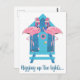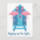Funny Flamingo Christmas greeting card postcard with flamingo couple decorating their beach hut with Christmas lights for the holidays and the words "Rigging up the Lights". Cute beach style postcard greeting to send to friends and family through the holiday season by the sea.