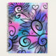 A funny little bird, lovely floral elements, and a little heart on a pink, purple and turquoise background.