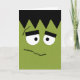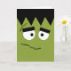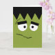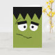 A funny Halloween greeting with Frankenstein face for a card. There are stitches on the left eye and the mouth is also stitched. The eyes are funny and cross eyed.