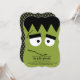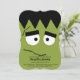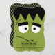 A funny Halloween greeting with Frankenstein face for a party invitation. There are stitches on the left eye and the mouth is also stitched. The eyes are funny and cross eyed.