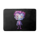 A bath mat with a cute illustration. Frankenstein monster with pink and purple hair and a dapper coat and tie.