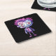 A paper coaster (sturdy pulp board) with a cute illustration. Frankenstein monster with pink and purple hair and a dapper coat and tie.