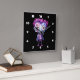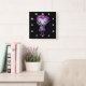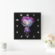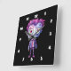 A clock with a cute illustration. Frankenstein monster with pink and purple hair and a dapper suit and tie.