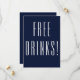 Funny navy blue and white Save the Date card with Free Drinks on the front and Oh, and By the Way, We are Getting Married! on the back. Personalise with names in script and city, state and your special wedding date to make sure people are ready to celebrate with you!