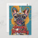A funny French Bulldog wearing glasses and a party hat wishes Happy Birthday