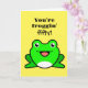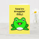 Funny frog 50th birthday card for her or him featuring a "you're froggin'" on the front with a funny green frog. This yellow and green frog birthday card would be great for frog lovers.