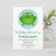 This boys baby shower invitation features a funny green frog with big eyes on a blue spiral background.