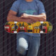 This colourful skateboard is designed for fun and energetic skaters. The design features distinct chraacterised fruits with funny facial expressions.