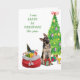 The German Shepherd dog on the front of this card states that he was "ready for Christmas" this year. He sits in front of a decorated Holiday tree, with a Santa sack of gifts beside him. One gift is already between his paws. The sentiment is continued on the inside, and should bring a smile to the recipient. All the text is easily changed to anything else you'd prefer.