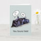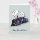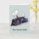 A funny get well soon card with a photograph of two sleeping gorillas cuddled together at the zoo. One gorilla has his feet resting on the other one's stomach. Front reads: You sound sick! Cartoon word bubbles: Grr, ill . . . ugh.
