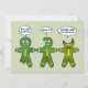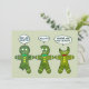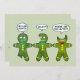 Funny gingerbread men in parody, spoof, to the bunny rabbits that says "My butt hurts". These 3 funny gingerbread men cookies with speech bubbles. The first gingerbread man has a bite on his leg and he says: "My Leg Hurts!", the other one has a bite on his ear and he says: "What?", the third one's eyes has been eaten and he says: "Where are you guys?". Especially fun for the Christmas Holiday Season. Cute Gingerbread man cartoon. The back is ready for a custom message "Sweet Wishes for the Holidays". Ready to be personalised with your family last name, or any surnames. Green Version.