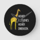 Funny Giraffe Pun Round Clock designed by Nisha Prabhu. Cute funny giraffe with pun words ''Higher Frequency. Higher Dimension.'' Make time for laughter with this pun-filled giraffe round clock! Add a touch of whimsy to your decor with this charming clock that's sure to bring a smile to your face every hour. Perfect for adding a playful vibe to any room or as a fun gift for the giraffe enthusiast in your life. Stand tall and stay on time with this delightful design that's bound to turn heads. Don't wait - bring a dose of humour to your space with this must-have clock from Cutehomegifts Zazzle!
