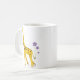 Cute mug with a funny cartoon giraffe nibbling on a violet flower and holding some flowers with its tail while roller skating.