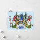 The front of this flat Holiday card has three funny little gnomes wishing you a Merry Christmas. The centre gnome is dressed in blue and holds a gold banner with red text that says "We wish you a Merry Christmas". On either side of him are gnomes dressed in red and green. Behind them are snow covered pine trees, and everything is placed on a sky blue background. The back of the card has another image of a gnome at the bottom, custom text fields for your own message and signature, and your own photograph. Bright, colourful, and fun!