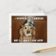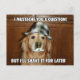 This funny postcard features a photograph of a smiling golden retriever dog who is wearing a hat with a moustache hanging on a string in front of his face. Front text reads, "I moustache you a question! But I'll shave it for later," while the customisable text on the back reads, "Let me mullet over for a while."
