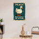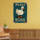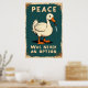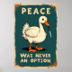 A cartoon white goose stands holding a knife in its beak, with the text "PEACE WAS NEVER AN OPTION" above and below it, set against a teal and beige background. Clear details and vibrant colours