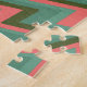 Puzzle with a funny and suspicious looking gorilla peeking from behind a cover designed in a pink and green zigzag chevron pattern.