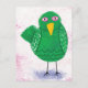 A funny green bird in folk art, childlike style over a pink and white mottled background.