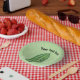 This paper bowl has a big funny green pickle with stem and a surprised face with open mouth and wide green eyes on a light green background. Customise your text with the template.