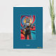 A cute funny cat greeting card feauring a grey tabby wearing red leather playing guitar with a gyre background.