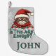 Add a touch of holiday humour to your fireplace with this funny grumpy cat Christmas stocking by Kaliverse Creations! Featuring a festive yet unimpressed cat tangled in Christmas lights with the phrase "Is This Jolly Enough?", this stocking is perfect for those who enjoy a bit of sarcasm during the holidays. Personalise it with a name to make it a unique gift or a hilarious addition to your holiday decor that friends and family will love.