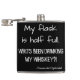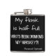 Funny and quirky slogan hip flask with text "My glass is half full. Who's been drinking my beer?!" quoted paranoid optimist.