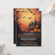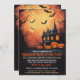The Halloween party invitation features a spooky scene with a haunted house positioned on the right side of the card. The haunted house is dark and dilapidated, with eerie glowing windows and a few Jack-o'-lanterns with mischievous grins placed around its front steps. On the left side of the card, a few bats are circling in the moonlit sky, adding to the creepy ambiance.