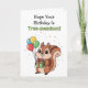 Adorable cartoon squirrel holding a birthday gift and balloons on the front of the birthday card. Inside is a cute squirrel pun. This birthday card is cute for anyone.