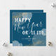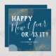 Funny 2021 holiday card featuring a blue background that can be changed to any colour, abstract circles, a sprinkle of faux gold glitter, and the funny quote "happy new year or is it?", your family name, and the year.