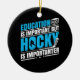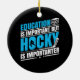 Funny hockey themed ornament with blue and white text on a black background reads Education is Important But Hockey is Importanter!