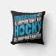 Funny hockey themed throw pillow with blue and white text on a black background reads Education is Important But Hockey is Importanter!