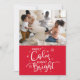 Funny Rarely Calm Always Bright saying in white hand lettered brush script on a red background holiday card with one photo on front and four photos with your message and names on back. This card will be a keeper and people are going to love it.