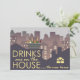 Creative cartoon style invitation design for a housewarming party to celebrate someones new home. Drinks tub with bottles is shown on top of the house. Please personalise text.