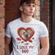 Funny pet owner t-shirt featuring the saying "I love my dog", with a photo of your doggy in the shape of a love heart, and a scattering of little red hearts.