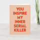 This greeting card features a light peach background with a funny, edgy message in the middle. The text reads “YOU INSPIRE MY INNER SERIAL KILLER,” and it’s written in bright red, all-capital letters. The letters are thick and simple, and the words are stacked in a neat column from top to bottom. There are no characters or extra objects, so your eyes go straight to the message. The soft background color makes the red text stand out, giving it a sweet look even though the line is dark humor. It feels like a cheeky card you’d give to someone who gets your kind of joke and can laugh with you
