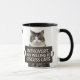 On two sides of this cute mug is an image of a grey and white tabby cat holding a sign that says "INTROVERT, but willing to DISCUSS CATS". Between the images is your custom text, name, or monogram.