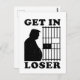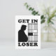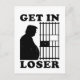 Funny political gift anti Trump postcard for democracy loving Americans who will NOT vote for the felon. Black graphic of a portly and corrupt Donald J Trump going to prison for all his crimes. "Get in loser". Trump for prison!