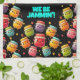 Add a touch of whimsy to the kitchen (and pay homage to the home canning experience) with this apron, which features a repeating pattern of AI-generated funny joyful jumping jars of colourful and jubilant jam, accompanied by the pun-filled original meme, "We Be Jammin'!" or personalise with your desired funny/food-themed tagline.