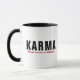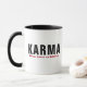 A black ceramic coffee mug with the humorous white text "Karma never loses an address."