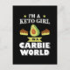 Beautiful gift idea and keto diet postcard showing a cute avocado and the text 'i'm a keto girl in a carbie world'. Amazing product for christmas or birthday and for every cook or chef. Handmade and customisable. For everyone who wants to lose weight and reach the ketosis.