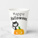These funny Halloween Party paper cups for kids feature a silly and smiling black cat sitting on top of a bright orange jack o' lantern pumpkin. The text reads "Happy Halloween" in distressed lettering.