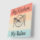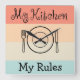 Funny home decor kitchen wall clocks with amusing my kitchen my rules saying on a designer coloured stripes pattern background in shades of peach and green. Designed as a humourous housewarming gift for the kitchen or dining room.