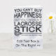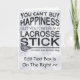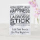 Custom made greetings cards and invitations with an original Game Face Gear design. Easy to edit templates, front text and inside text can be changed to whatever you want! Great for all your sports mad family and friends. Funny lacrosse design, text reads: You Can't Buy Happiness. But You Can Buy a Lacrosse Stick and that's kinda the same thing. Big bold design great for t-shirts and hoodies!