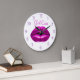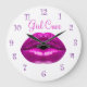 Funny girl cave wall decor clock for ladies or girls with big purple lipstick lips and fancy clock face numbers and the words Girl Cave you can personalise if you want to.