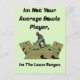 Pictured is a lawn bowler on a dimensional bowls green with some funny words of not being average