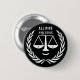 Lawyer button gift or graduation party favours featuring cartoon scales of justice and creative quote.