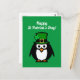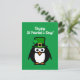 Funny leprechaun penguin St Patrick's Day postcard. Green cartoon design with lucky clover aka shamrock. Fun for kids and adults.